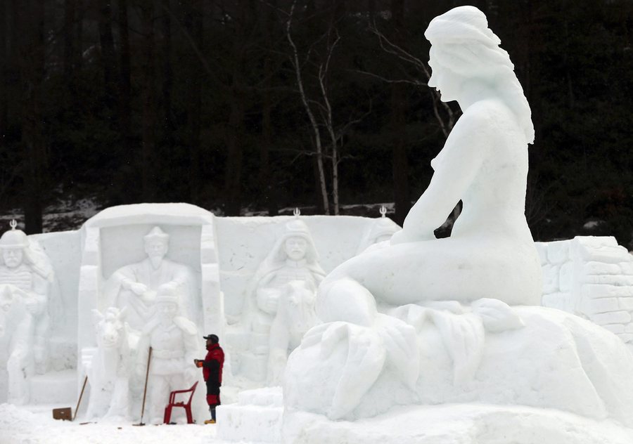 epaselect epa05712040 A worker puts the finishing touches on a snow sculpture at a park in Taebaek, about 270km southeast of Seoul, South Korea, 12 January 2017, during the eve of an annual snow festival that will run till 22 January. EPA/YONHAP SOUTH KOREA OUT