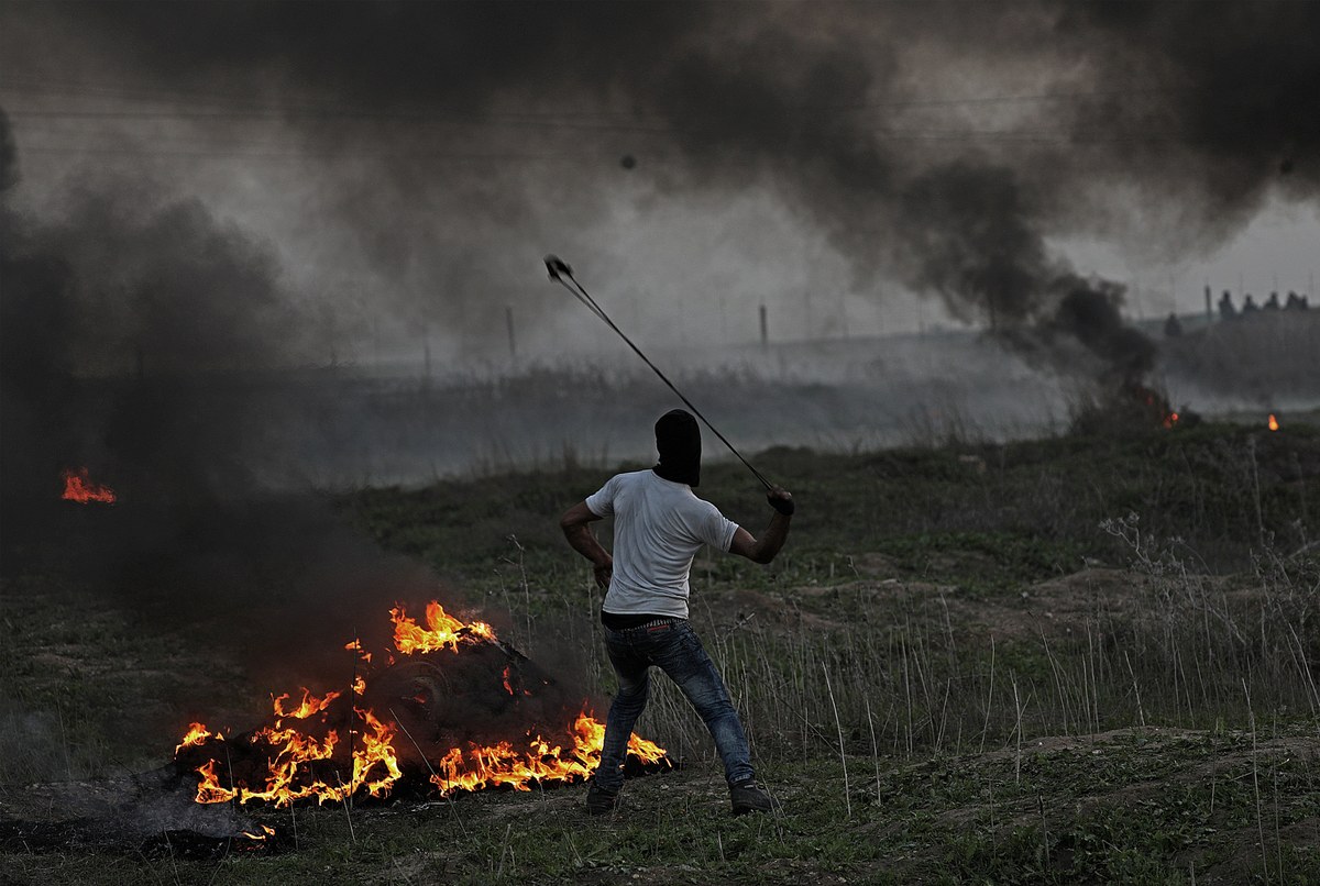 epa06434219 A Palestinian protester throws stones at Israeli troops during clashes near the border between Israel and Gaza Strip, in the east Gaza City, 12 January 2018. More than forty Palestinians protesters were injured during the clashes in the east Gaza Strip. EPA/MOHAMMED SABER