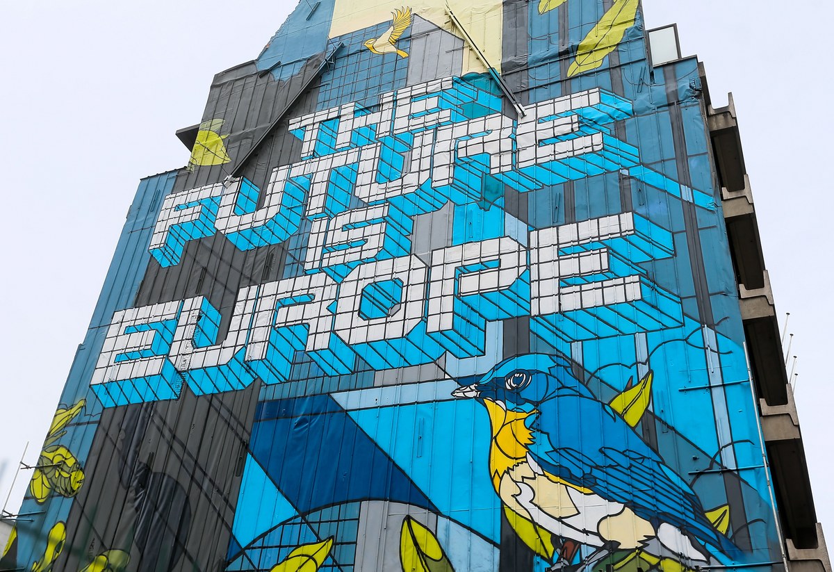 epa06120848 A view of the fresco 'The Future Is Europe' by the URBANA Project in the European district in Brussels, Belgium, 02 August 2017. EPA/STEPHANIE LECOCQ