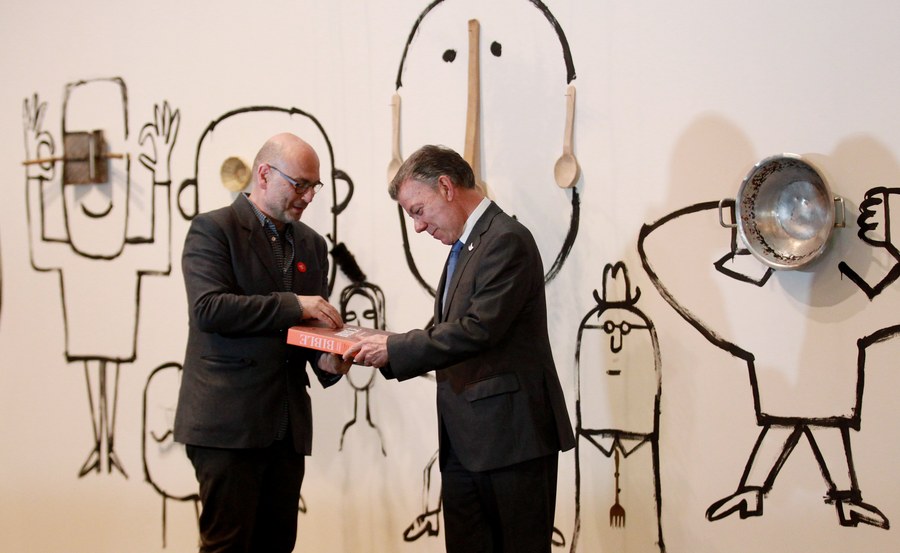 epa05928093 President of Colombia Juan Manuel Santos (R) receives a bible illustrated by French illustrator Serge Bloch (L) during the Bogota International Book Fair opening in Bogota, Colombia, 25 April 2017. The event runs until 08 May. EPA/LEONARDO MUNOZ