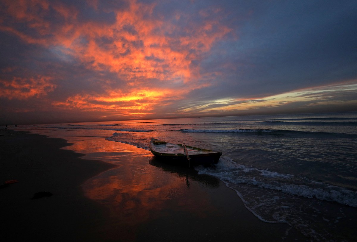 epa06407111 A fisherman boat by the beach after they returned from sea, during sunset off the coast of Gaza City, 27 December 2017. EPA/MOHAMMED SABER