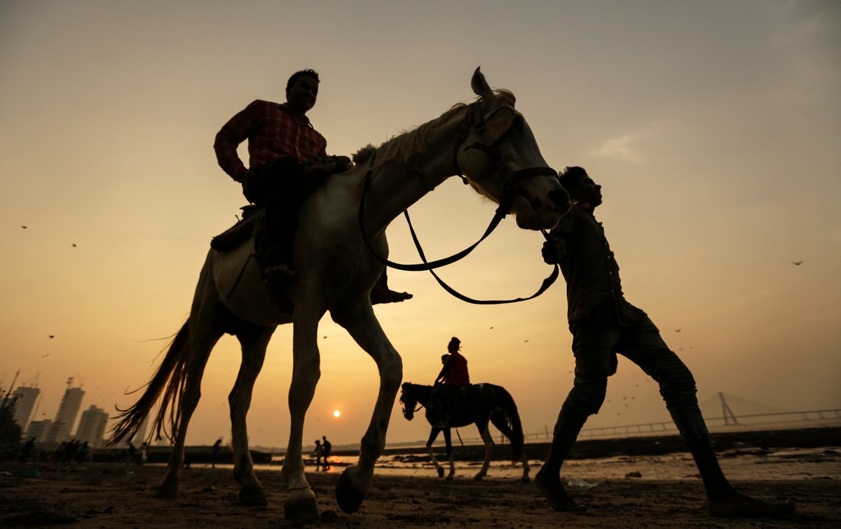 epa06332985 People ride horses at a beach near the Arabian Sea shore in Mumbai, India, 16 November 2017. EPA/DIVYAKANT SOLANKI