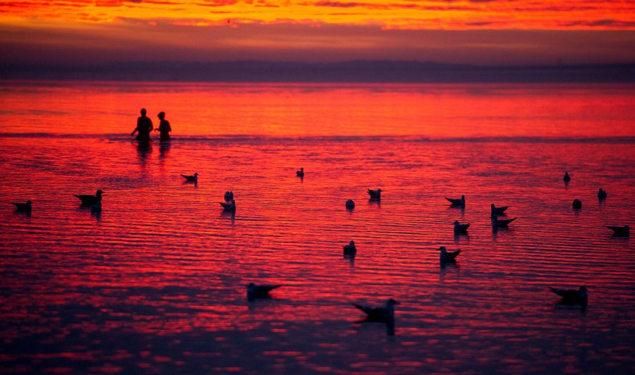 epa05643756 The rising sun casts a warm, glowing light on the open-air swimming bath where the silhouettes of two early swimmers can be seen near the island of Ruegen in Stralsund, Germany, 23 November 2016. The weather forecast predicts warm wintry weather for the region for the upcoming days. EPA/STEFAN SAUER