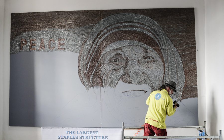 epa05635071 Guinness World Record holder Albanian artist Saimir Strati working on a mosaic of Saint Teresa in Pristina, Kosovo, 17 November 2016. Strati plans to complete the 10 square meter mosaic in 28 days using 1,500,000 staples. The mosaic will be placed inside the national museum of the Republic of Kosovo and is expected to become Strati's tenth world record and the world’s largest mosaic made from staples. EPA/VALDRIN XHEMAJ