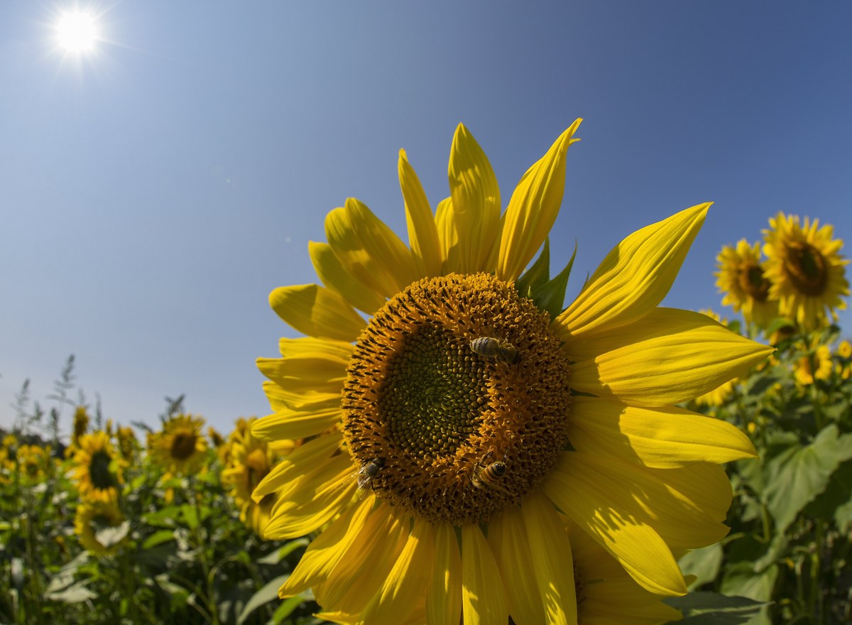 epa06198581 Bees feed on a sunflower at Colby Farm in Newbury, Massachusetts, USA 11 September 2017. Temperatures in the region were to reach a high of 80F (26C). EPA/CJ GUNTHER