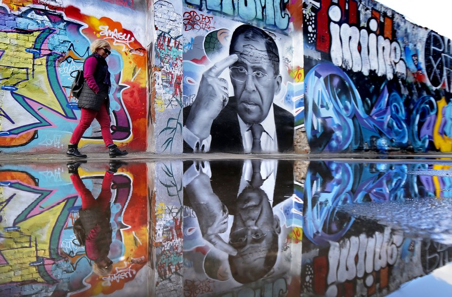 epa05865809 A woman walks by a graffiti depicting Russian Foreign Minister Sergei Lavrov by Russian artist Daniil Sudnev in Moscow, Russia, 23 March 2017. Sudnev (aka Sourt One) created the graffiti to mark Lavrov's 67th birthday. EPA/YURI KOCHETKOV