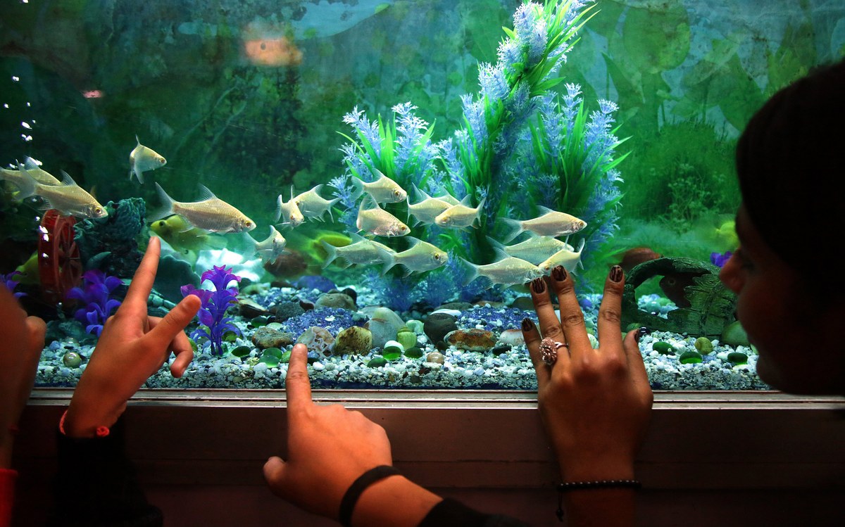 epa06342014 Indian collage girls look at fish swimming in an aquarium on the occasion of World Fisheries day in Jammu, the winter capital of Kashmir, India, 21 November 2017. World Fisheries day is celebrated every year on 21 November throughout the world by the fishing communities. EPA/JAIPAL SINGH