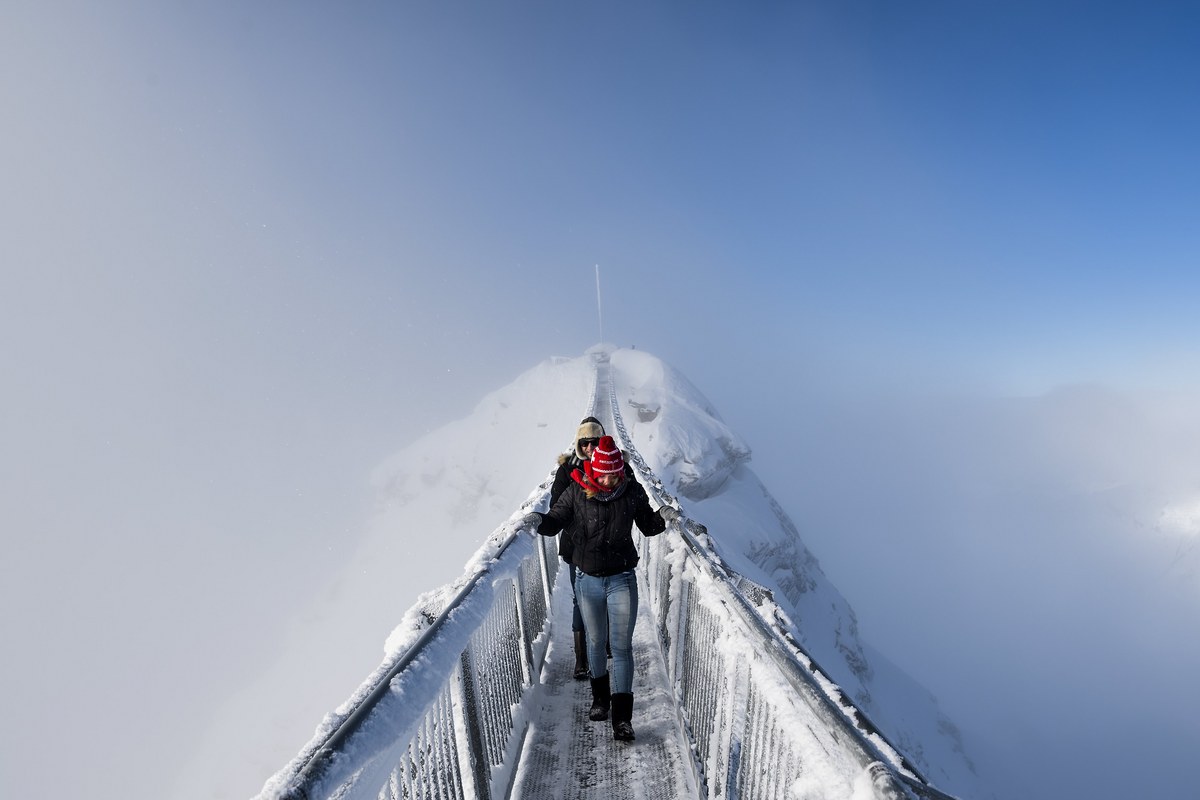 epa06400049 Two tourists walk on the 'Peak Walk' suspension bridge on a winter day at the Glacier 3000 on the Col du Pillon between Gstaad and Les Diablerets, in Switzerland, 20 December 2017. EPA/JEAN-CHRISTOPHE BOTT
