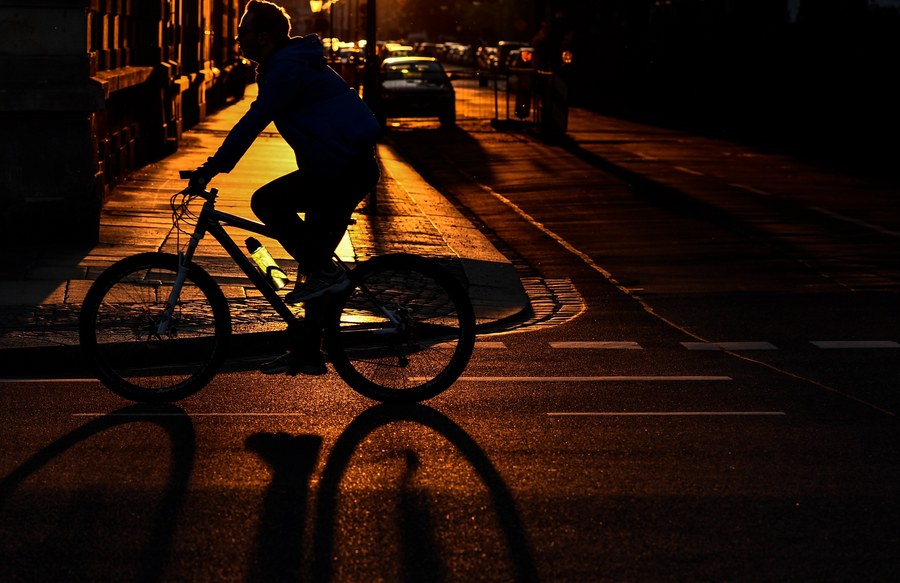 epa05966804 A cyclist ride his bike in a street during sunset in Dresden, Germany, 15 May 2017. Meteorologists predict the warm weather with temperatures around 21 degrees Celsius in the next days in Saxony. EPA/FILIP SINGER