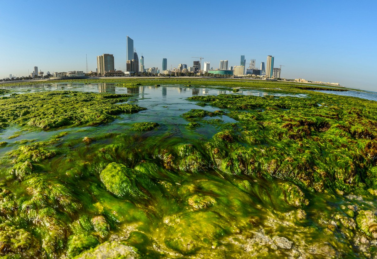 epa06254082 YEARENDER 2017 FEBRUARY Green algae sits on a beach in Kuwait City, Kuwait, 28 February 2017. The formation of green algae is a normal phenomenon that occurs every year at the shores of Kuwait. EPA/RAED QUTENA