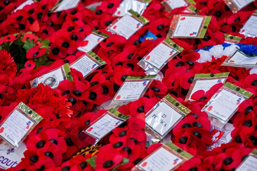 epa05626621 Poppy wreaths during a ceremony commemorating the end of World War One at the Menin Gate memorial in Ypres, northern Belgium, 11 November 2016. The Menin Gate is a massive memorial bearing the names of 55,000 British and Commonwealth soldiers killed in the war and whose bodies were never found. EPA/STEPHANIE LECOCQ