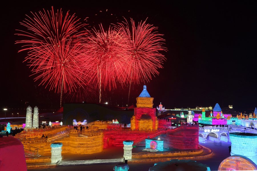 epa05699198 Fireworks display over the ice sculptures at the 33rd Harbin International Ice and Snow Festival in Harbin city, China's northern Heilongjiang province, 05 January 2017. Some 180,000 cubic meters of ice and 150,000 cubic meters of snow were used to build the 800,000-square-meter Harbin ice and snow world where the festival will last for about three months. EPA/WU HONG