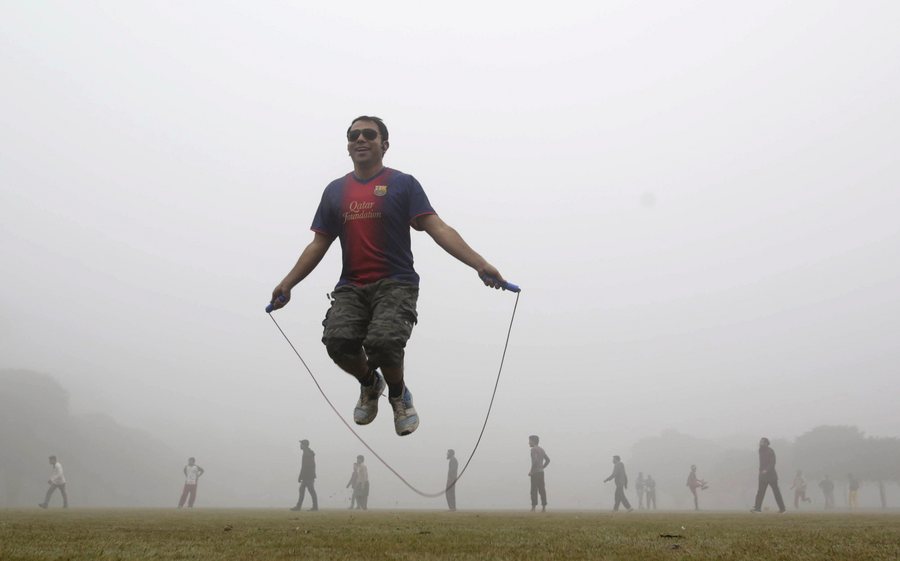 epa05691525 A man jumps in a jumping rope in a park covered with a heavy fog in Lahore, Pakistan, 30 December 2016. Many cities in Pakistan are experiencing unusual cold weather conditions as regular daytime temperatures fell to subzero degrees Celsius in wide parts of the country. EPA/RAHAT DAR