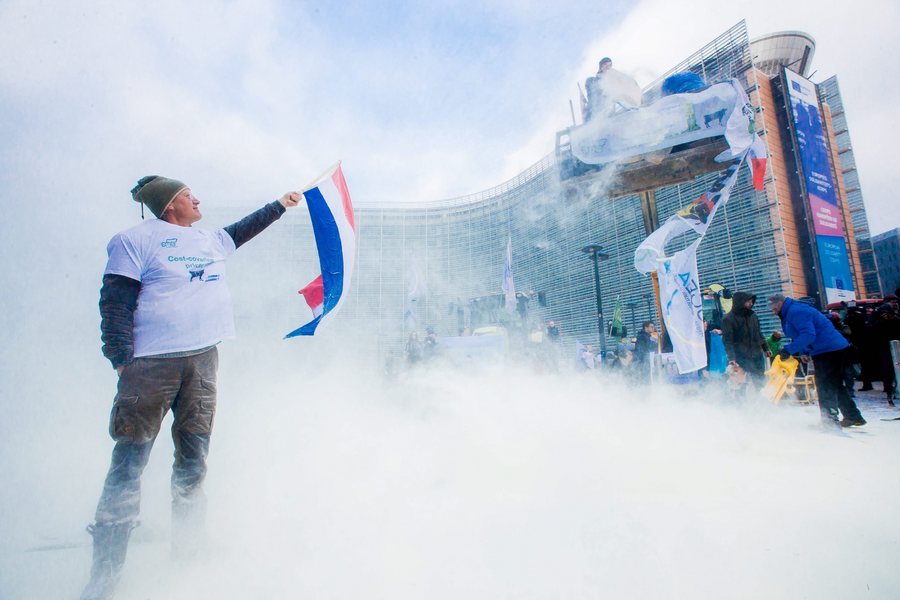 Αντιπρόσωποι από το Ευρωπαϊκό Συμβούλιο Γάλακτος ρίχνουν σπρέι από σκόνη γάλακτος μπροστά στην έδρα του Συμβουλίου της ΕΕ, κατά την διάρκεια μιας συνάντησης των Υπουργών Γεωργίας της ΕΕ στις Βρυξέλλες. Το ΕΣΓ διαμαρτύρεται πως η αγορά γάλακτος έχει κολλήσει στην κρίση καθώς η πώληση σκόνης γάλακτος από τα αποθέματα παρέμβασης της ΕΕ θέτει την αγορά υπό πίεση. PHOTO: STEPHANIE LECOCQ