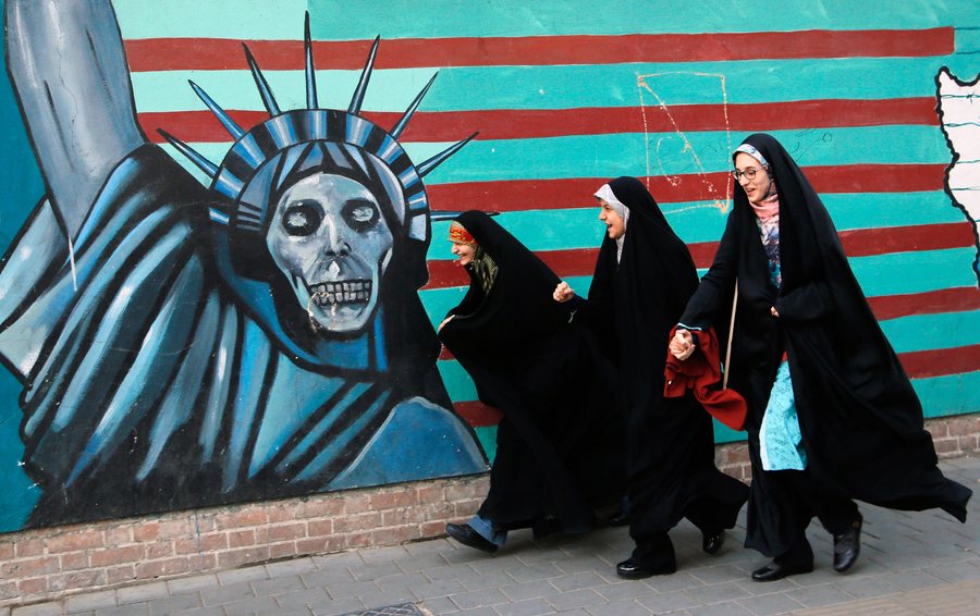 epa05615578 Iranian female students walk next to an anti-US mural on their way to the former US embassy in Tehran to attend a demonstration marking the 37th anniversary of US Embassy takeover in front of the former US embassy in Tehran, Iran, 03 November 2016. Thousands of protesters chanting 'Death to America' gathered at the former US embassy in Tehran to mark the 37th anniversary of the start of the Iran hostage crisis. American, Israel and Saudi Arabia flags were trodden on and burned by participants, who take to the streets every year on 03 or 04 November in a so-called 'day of national confrontation against world imperialism'. EPA/ABEDIN TAHERKENAREH