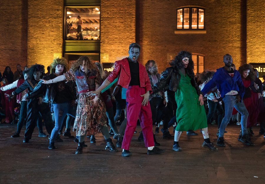 epaselect epa05611987 Professional dancers dressed as zombies perform Michael Jackson's Thriller in front of Granary Square to celebrate Halloween in London, Britain, 31 October 2016. The 100 dancers performed two full-on flash mobs. EPA/HAYOUNG JEON