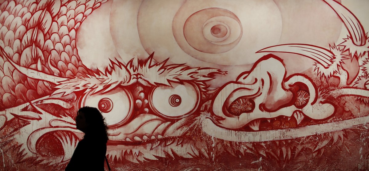 epa06276619 A visitor walks past "Dragon in the Clouds - Red Mutation (2010) as part of the exhibition "Takashi Murakami: Lineage of Eccentrics" at the Museum of Fine Arts in Boston, Massachusetts, USA 19 October 2017. The Museum of Fine Arts Boston is showcasing the work of Japanese artist Takashi Murakami through 01 April 2018. EPA/CJ GUNTHER