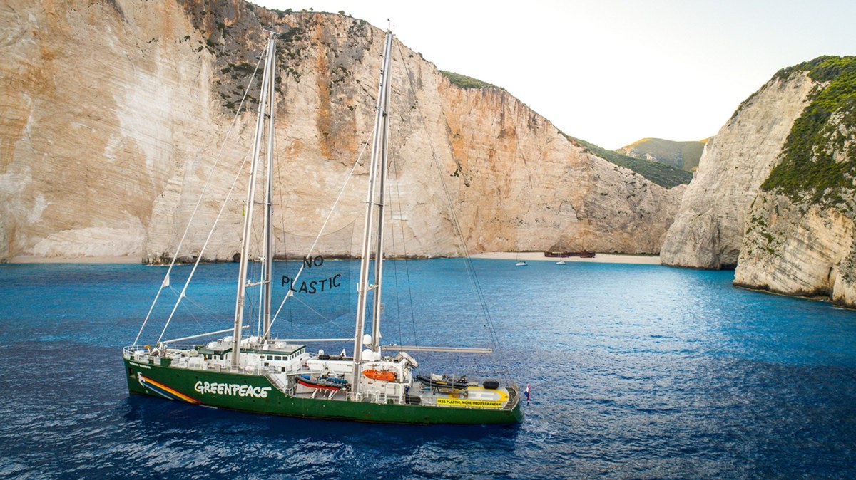 epa06099295 A handout photo made available by Greenpeace shows Greenpeace's ship Rainbow Warrior III sailing in front of Zakynthos island in the Ionian Islands as part of their environmental tour to raise awareness about the plastic residues in the sea, in Greece, 20 July 2017. The Rainbow Warrior III is on an EU wide tour to highlight the need to protect the seas from the use of plastic. EPA/GREENPEACE HANDOUT HANDOUT EDITORIAL USE ONLY/NO SALES