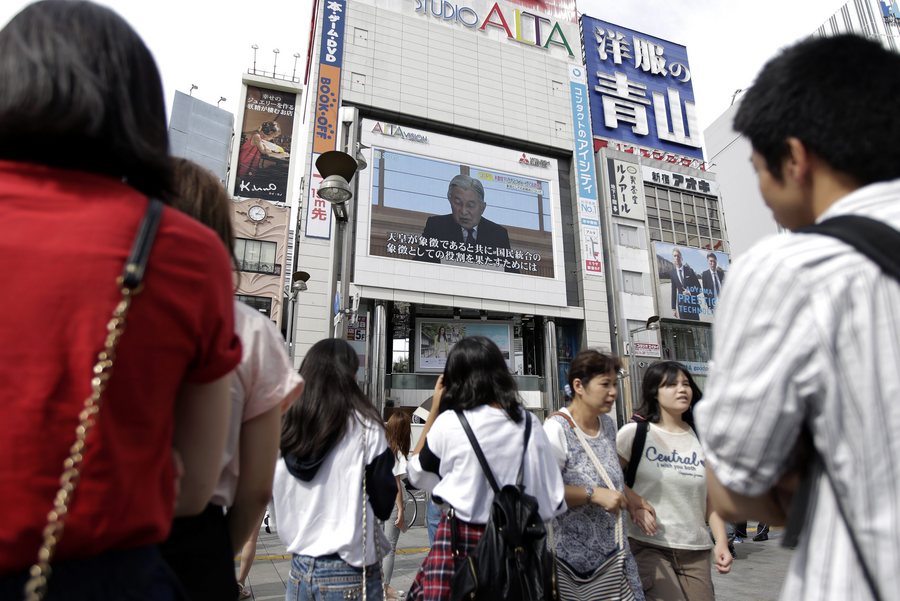 Περαστικοί παρακολουθούν την αναμετάδοση σε μεγάλη οθόνη των δηλώσεων του Ιάπωνα Αυτοκράτορα Ακιχίτο και τις σκέψεις του για το έθνος. Τόκιο, Ιαπωνία. ΕΡΑ / KIYOSHI OTA