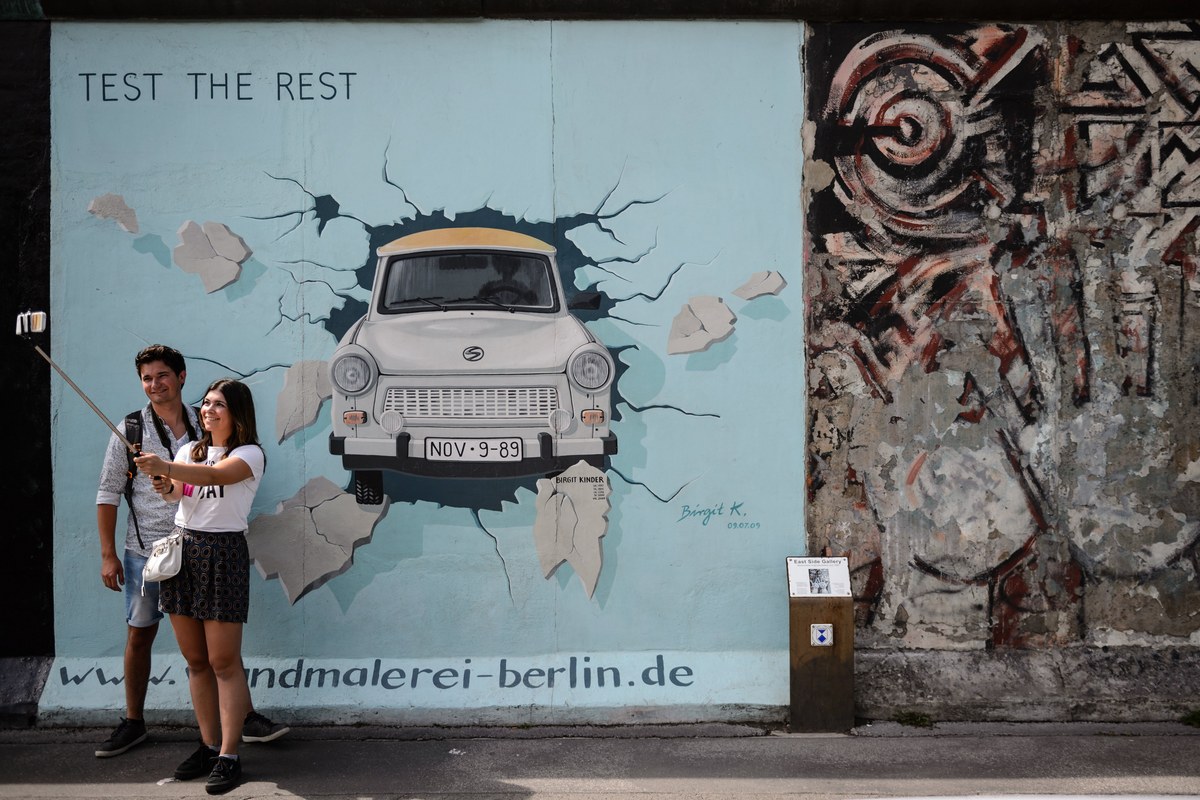 epa06135325 Tourists take selfies in front of the mural 'Test the Rest' by artist Birgit Kinder at a section of the former Berlin Wall called the East Side Gallery in Berlin, Germany, 10 August 2017. The former East German communist regime started the construction of the Berlin Wall on 13 August 1961, 56 years ago. The Wall came down on 09 November 1989. EPA/JENS SCHLUETER
