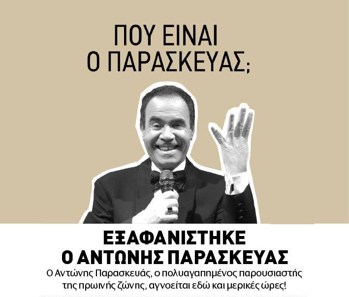 Ο Αντώνης Παρασκευάς, ο πολυαγαπημένος παρουσιαστής της πρωινής ζώνης, αγνοείται εδώ και 2 μέρες! H ανακοίνωση της εξαφάνισής του έπεσε ως κεραυνός εν αιθρία στον κόσμο της τηλεόρασης. Για πρώτη φορά στην καριέρα του, ο Παρασκευάς δεν εμφανίστηκε στο στούντιο της εκπομπής του. Φίλοι και συνεργάτες περνούν στιγμές αγωνίας και τον ψάχνουν απεγνωσμένα, αφού τόσο το κινητό του είναι εκτός λειτουργίας όσο και το σπίτι του άδειο.