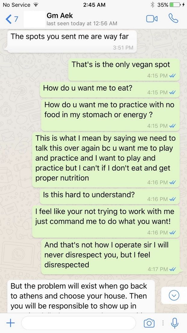«Αυτό είναι το μόνο vegan μέρος. Πώς θέλετε να φάω; Πόσο δύσκολο είναι να καταλάβετε ότι δεν μπορώ να προπονηθώ αν δεν τραφώ σωστά; Αυτό εννοώ όταν λέω ότι πρέπει να συζητήσουμε ξανά, επειδή θέλετε να προπονηθώ και να παίξω, αλλά αν δεν φάω σωστά, δεν μπορώ να τα κάνω. Αισθάνομαι ότι δεν προσπαθείτε να συνεργαστείτε μαζί μου, αλλά απλώς μου δίνετε εντολές. Δεν λειτουργώ όμως έτσι και δεν θα δείξω ποτέ έλλειψη σεβασμού, αλλά αισθάνομαι ότι εσείς δε με σέβεστε», επανέρχεται ο Έρλι.