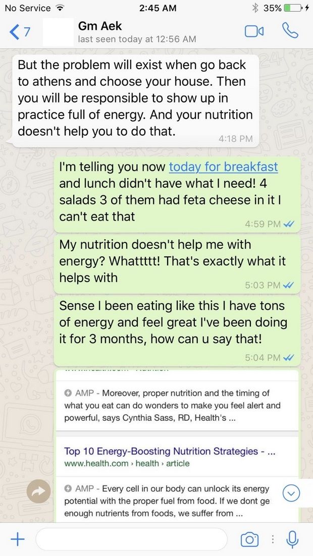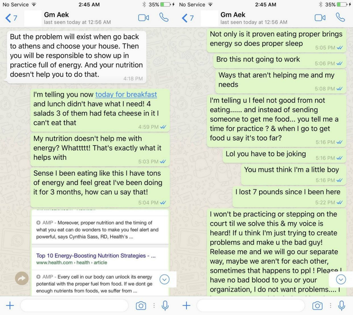 «Αλλά το πρόβλημα θα συνεχίσει να υπάρχει όταν γυρίσουμε στην Αθήνα κι επιλέξεις το σπίτι σου. Τότε θα πρέπει να εμφανίζεσαι στις προπονήσεις στην ώρα σου, γεμάτος ενέργεια. Και η διατροφή σου δεν σε βοηθάει σε αυτό» ήταν το σχόλιο που έλαβε ως απάντηση από την άλλη πλευρά. «Σας λέω ότι σήμερα για πρωινό και μεσημεριανό δεν είχα ό,τι χρειαζόμουν! Από τις τέσσερις σαλάτες, οι τρεις είχαν φέτα και δεν μπορώ να το φάω αυτό. Η διατροφή μου δεν με βοηθάει με την ενέργεια; Τιιιιι; Αυτή ακριβώς είναι που την βοηθάει. Από τότε που άρχισα να τρέφομαι έτσι, έχω περισσεύματα ενέργειας και νιώθω τέλεια. Το κάνω εδώ και τρεις μήνες, πως μπορείτε να το λέτε αυτό!» Και συνεχίζει μέχρι που τελικά ζητάει την αποδέσμευσή του. «Όχι μόνο έχει αποδειχθεί ότι τρώω σωστά, αλλά αυτή η διατροφή με βοηθάει να κοιμάμαι σωστά. Φίλε δεν θα δουλέψει αυτό. Νιώθω ότι δεν βοηθάτε τις ανάγκες μου. Σας λέω ότι δεν αισθάνομαι καλά επειδή δεν τρώω, αλλά αντί να στείλετε κάποιον να μου φέρει φαγητό, μου λέτε να είμαι στην ώρα μου στην προπόνηση, όταν πρέπει να πάω τόσο μακριά για να φάω; Πρέπει να κάνετε πλάκα και να νομίζετε ότι είμαι παιδί. Έχασα τρία κιλά από τότε που ήρθα. Δεν θα προπονηθώ και δεν θα πατήσω το γήπεδο μέχρι να λυθεί το θέμα και να ακουστεί η φωνή μου. Δεν προσπαθώ να δημιουργήσω πρόβλημα,ούτε να σε κάνω να φαίνεσαι κακός. Λύστε το συμβόλαιό μου και θα ακολουθήσουμε διαφορετικό δρόμο, ίσως δεν ταιριάζουμε, αυτό συμβαίνει. Δεν κρατάω κακία σε κανέναν, δεν θέλω προβλήματα».