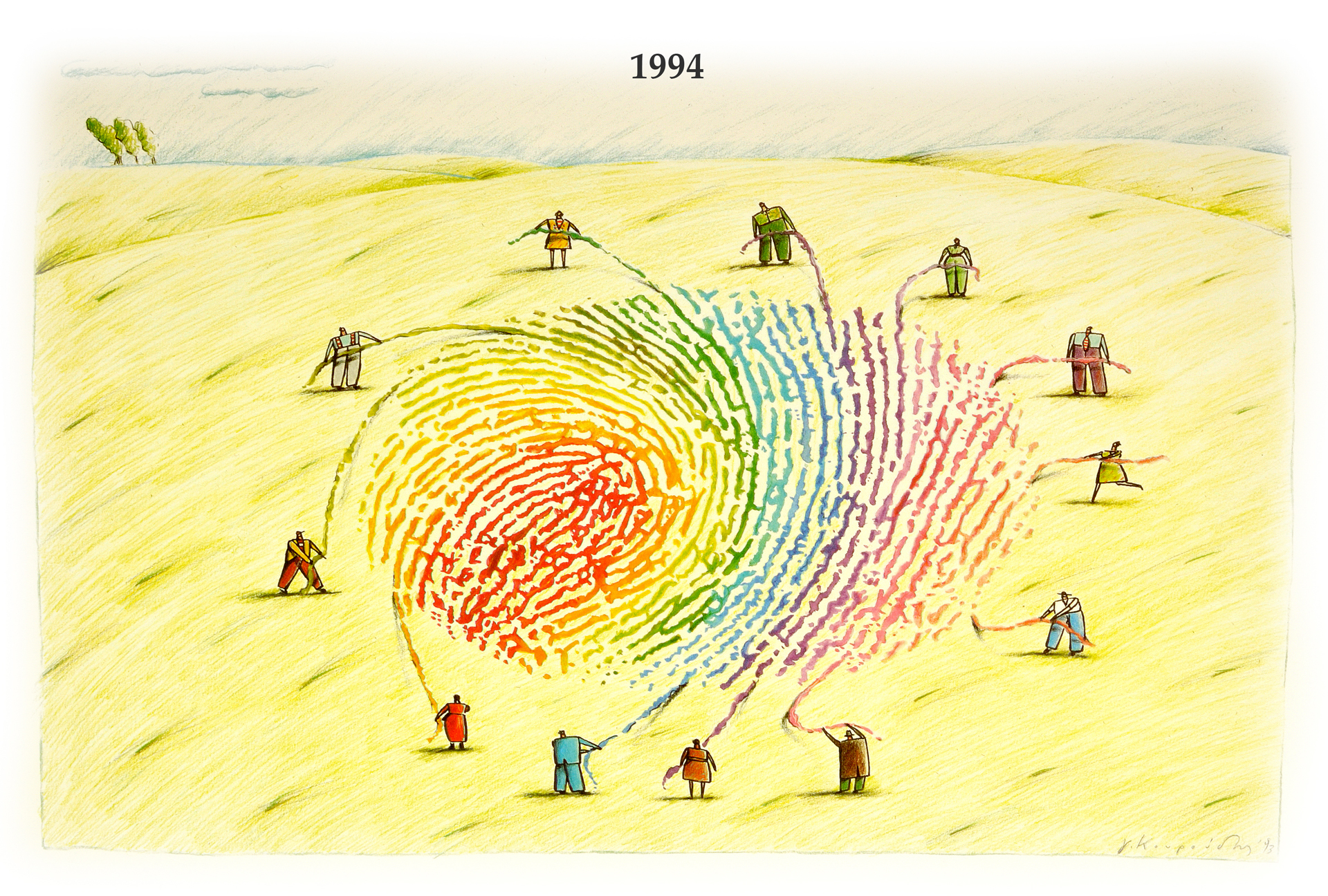 Η εικονογράφηση του Γιάννη Κουρούδη κλείνει 20 χρόνια. Την είχε παραγγείλει το γραφείο του Ζακ Ντελόρ για την ευχητήρια κάρτα του 1994. Μεγάλη τιμή και – όπως συμβαίνει με τις καλές δουλειές – πάντα επίκαιρη. Ρίξτε μια ματιά στους Jeunes Européens fédéralistes και τη σελίδα τους JEF.