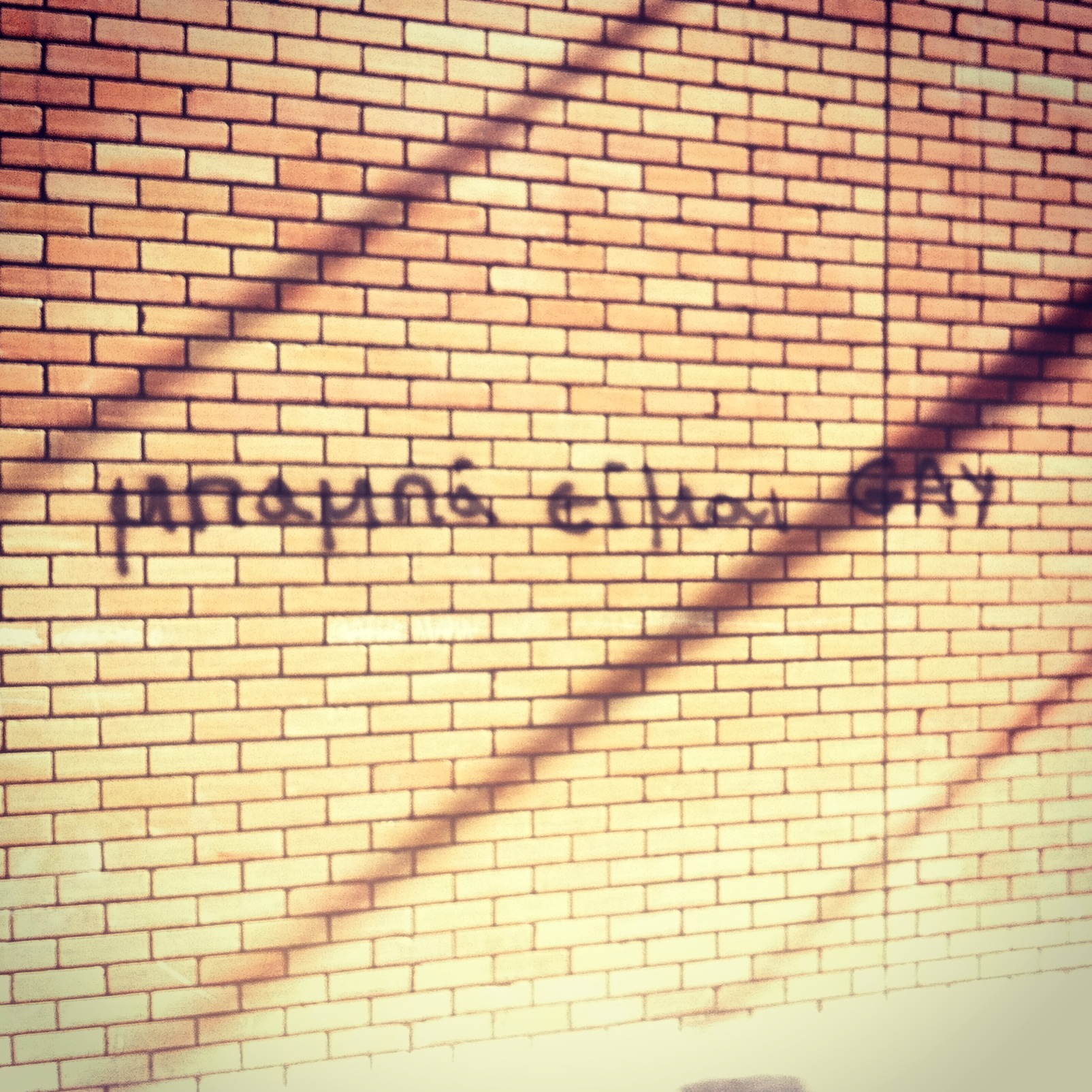 Πιθανόν ο άνθρωπος με το σπρέι να μην είναι στην πραγματικότητα γκέι, αλλά να ήθελε απλώς να δώσει ένα μήνυμα. Πιθανόν να γούσταρε να λερώσει τον τοίχο του Γαλαξία για να εντυπωσιάσει τους φίλους του. Ίσως να ήταν ειρωνικό απέναντι στους γκέι όλου του κόσμου που ντρέπονται να το πουν στο μπαμπά τους. Μπορεί ακόμα ακόμα να είναι και κοροϊδευτικό. Όπως και να έχει, κάθε φορά που θα πάρω απόφαση να πάω μέχρι το γυμναστήριο και θα περάσω από μπροστά του, αυτή η φράση, ανεξαρτήτως κινήτρου, που περιγράφει με τρεις λέξεις την αγωνία μιας ολόκληρης ζωής πολλών ανθρώπων, φίλων, γνωστών ή συναδέλφων, που ακόμα και σήμερα δυσκολεύονται να αποκαλύψουν τη σεξουαλική τους ταυτότητα αν δεν έχουν την πολυτέλεια να ζουν σε χώρους που είναι ανεκτικοί απέναντι σε αυτήν, θα τη βρω εκτός από συγκινητική, και αρκούντως εύστοχη.