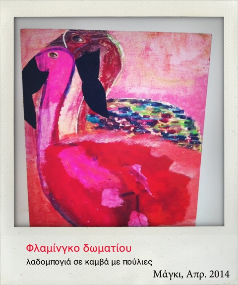 Tα ψιλά της έμειναν στις τσέπες του δερμάτινου διότι δεν αλλάζουν. Πριν φύγει μου άφησε ένα πιτσιλωτό φλαμίνγκο με γκλίτερ για το δωμάτιό μου. Θηλυκή Βαν Κογκ. Της ευχήθηκα καλή τύχη και να μην κόψει το αυτί της για χάρη μου.
