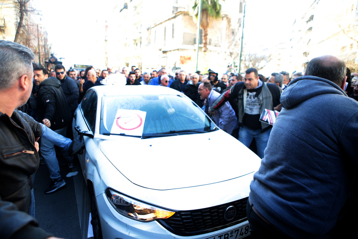 Ταξιτζήδες περικυκλώνουν οχημα ιδιωτικής εταιρείς μετακίνησης , Τρίτη 6 Μαρτίου 2018. Σε προειδοποιητική στάση εργασίας από τις 8 το πρωί έως και τις 5 το απόγευμα προχωρούν σήμερα οι ταξιτζήδες στην Αττική αντιδρώντας σύμφωνα με ανακοίνωση του Συνδικάτου Αυτοκινητιστών Ταξί Αττικής (ΣΑΤΑ στην «παράνομη και αυθαίρετη εισβολή της Uber στις επιβατικές μεταφορές». ΑΠΕ-ΜΠΕ/ΑΠΕ-ΜΠΕ/Παντελής Σαίτας