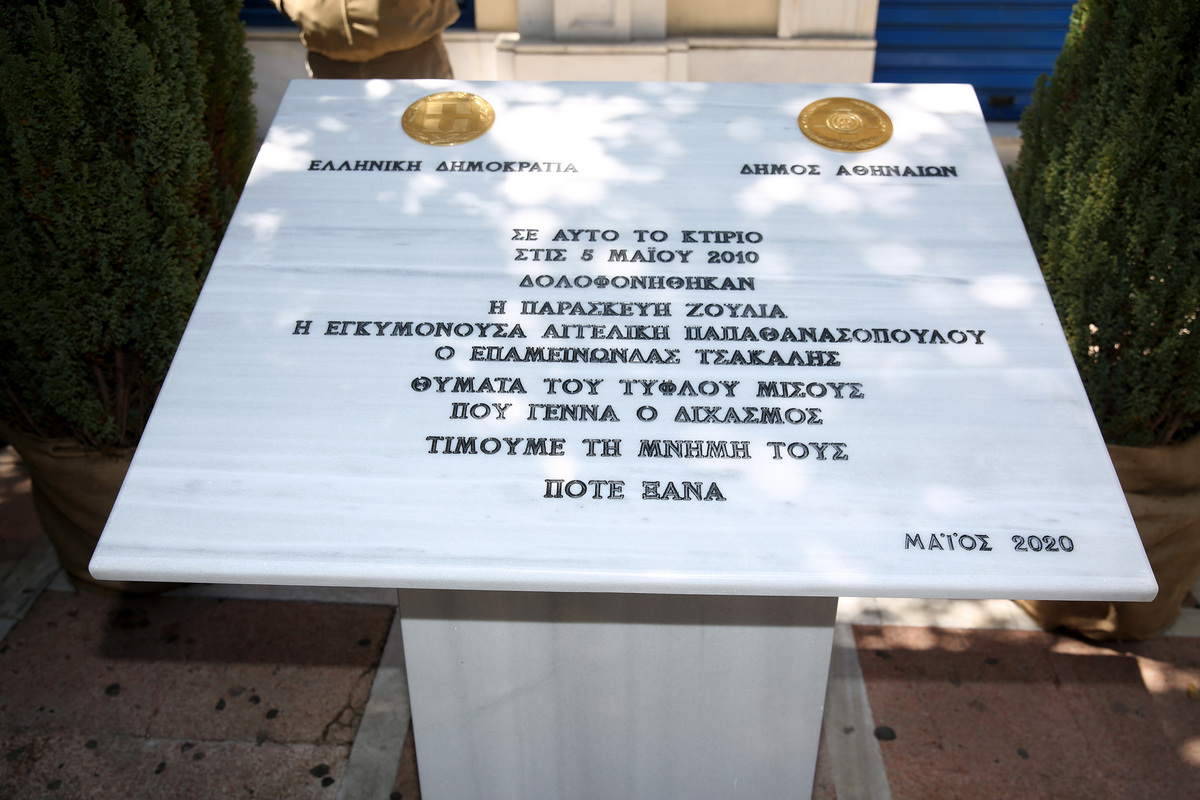 Η πλακέτα κατά τη διάρκεια της τελετής των αποκαλυπτηρίων της, στο χώρο όπου δολοφονήθηκαν οι τρεις εργαζόμενοι της Marfin, στην οδό Σταδίου, το Σάββατο 9 Μαΐου 2020. Πέρασαν 10 χρόνια και 4 μέρες από τα θλιβερά γεγονότα στην τράπεζα Marfin - Εγνατία, στην οδό Σταδίου, η τραγωδία έγινε στις 5 Μαΐου του 2010 όπου κατά τη διάρκεια διαδηλώσεων κατά των οικονομικών μέτρων για την υπογραφή της δανειακής σύμβασης ομάδα αγνώστων, έριξαν βόμβες μολότοφ στην τράπεζα την ώρα που βρίσκονταν μέσα σε αυτήν περίπου 25-30 εργαζόμενοι. Οι περισσότεροι κατόρθωσαν να διαφύγουν, πέντε άτομα διέσωσε η Πυροσβεστική, τρεις όμως άνθρωποι πέθαναν από ασφυξία λόγω των τοξικών αναθυμιάσεων και του πυκνού καπνού. Η ταυτότητα των αυτουργών της επίθεσης δεν έχει επιβεβαιωθεί μέχρι και σήμερα. Στη μνήμη των θυμάτων της τραγωδίας, της Αγγελικής Παπαθανασοπούλου (32 ετών-έγκυος 4 μηνών), του Επαμεινώνδα Τσάκαλη (36 ετών) και της Παρασκευής Ζούλια (35 ετών) έγινε ο εντοιχισμός πλακέτας, στο χώρο όπου δολοφονήθηκαν οι εργαζόμενοι της Marfin, με πρωτοβουλία του πρωθυπουργού Κυριάκου Μητσοτάκη και παρουσία της Προέδρου της Δημοκρατίας Κ