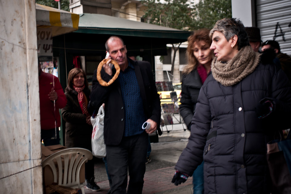 Δεν πίστευαν στα μάτια τους οι περαστικοί της Πλατείας Συντάγματος. Όχι δεν πρόκειται για ψέμα ούτε για φωτογραφική παραίσθηση. Αφού τελείωσε την ομιλία του στη Βουλή και πριν εκπονήσει το σχέδιο που θα παρουσιάσει στο Eurogroup, o Γιάνης Βαρουφάκης περπάτησε σαν απλός θνητός, χωρίς αστυνομική προστασία και συνομίλησε με τους πολίτες. Μάλιστα κάποια στιγμή σταμάτησε και θέλοντας να κατευνάσει την πείνα του αγόρασε με δικά του λεφτά ένα κουλούρι. Όπως, βλέπετε στη φωτογραφία-ντοκουμέντο κατάφερε με έναν μαγικό τρόπο να κάνει ένα σημαντικό τηλεφώνημα κρατώντας το κινητό και το κουλούρι με το ένα χέρι. Πολιτικός πολιτισμός, άλλα ήθη, επαφή με την κοινωνία, οι άνθρωποι της διπλανής πόρτας στην εξουσία όχι μόνο διαπραγματεύονται με τους Ευρωπαίους αλλά ενισχύουν και τους κουλουρτζήδες του κέντρου.