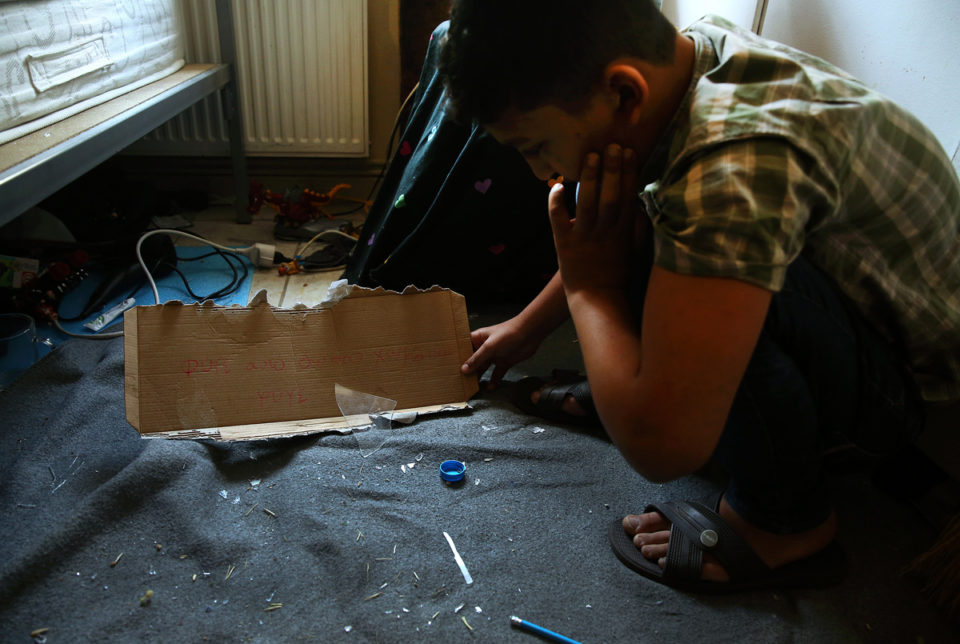 Ο 11χρονος Αμίρ από το Αφγανιστάν που είχε κληρωθεί για σημαιοφόρος από το σχολείο του, κρατάει ένα χαρτόνι που πέταξαν, μαζί με πέτρες και μπουκάλια μέσα στο δωμάτιό του, στο σπίτι όπου μένει, άγνωστοι στις 3 τα ξημερώματα, Αθήνα, Παρασκευή 03 Νοεμβρίου 2017. ΑΠΕ-ΜΠΕ/ΑΠΕ-ΜΠΕ/ΣΥΜΕΛΑ ΠΑΝΤΖΑΡΤΖΗ