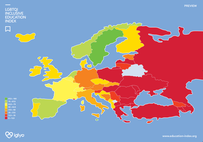 IGLYO – Πανευρωπαϊκή Οργάνωση ΛΟΑΤΚΙ Νέων και Μαθητών (International Lesbian, Gay, Bisexual, Queer & Transgender Youth and Student Oganization), φανερώνει την ολιγωρία των ελληνικών αρχών για την προάσπιση των δικαιωμάτων της LGBTQI κοινότητας στο χώρο της εκπαίδευσης. Για του λόγου το αληθές, η Ελλάδα σκοράρει μόλις 5 βαθμούς ευρισκόμενη στις «κόκκινες» χώρες, μεταξύ των οποίων η Βουλγαρία, η Τουρκία και η Ρωσία.