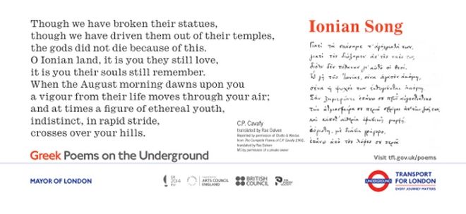 Το ποίημα Ιωνικόν του Κ.Π. Καβάφη μεταφρασμένο στα αγγλικά και δίπλα το πρωτότυπο, όπως θα “κυκλοφορεί” στους συρμούς του Λονδίνου