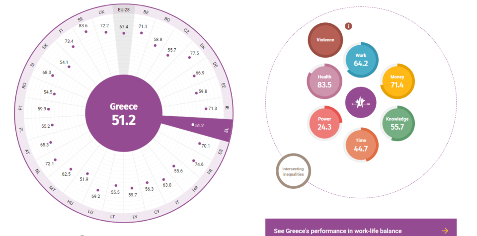 Δεν μας εξέπληξε. Τι; Το ότι η Ελλάδα κατάφερε στον Δείκτη Ισότητας Φύλων Ευρωπαϊκής Ένωσης να πιάσει μόλις 51.2 πόντους, σκορ που την κατατάσσει πανηγυρικά τελευταία μεταξύ των 28 χωρών της ΕΕ. Γιατί δεν μας εξέπληξε; Γιατί εδώ ζούμε και ξέρουμε τι μας συμβαίνει. Όμως έχει σημασία να δούμε αναλυτικά τι σημαίνει αυτό και πώς επιβεβαιώνει ότι η ελληνική κοινωνία αλλά και το ελληνικό κράτος ζητάει από τις γυναίκες να είναι πανταχού παρούσες χωρίς να τις στηρίζει έμπρακτα. Δεν είμαστε εδώ μόνο για να δίνουμε αλλά και για να παίρνουμε, με διεκδικήσεις, ό,τι μας ανήκει.