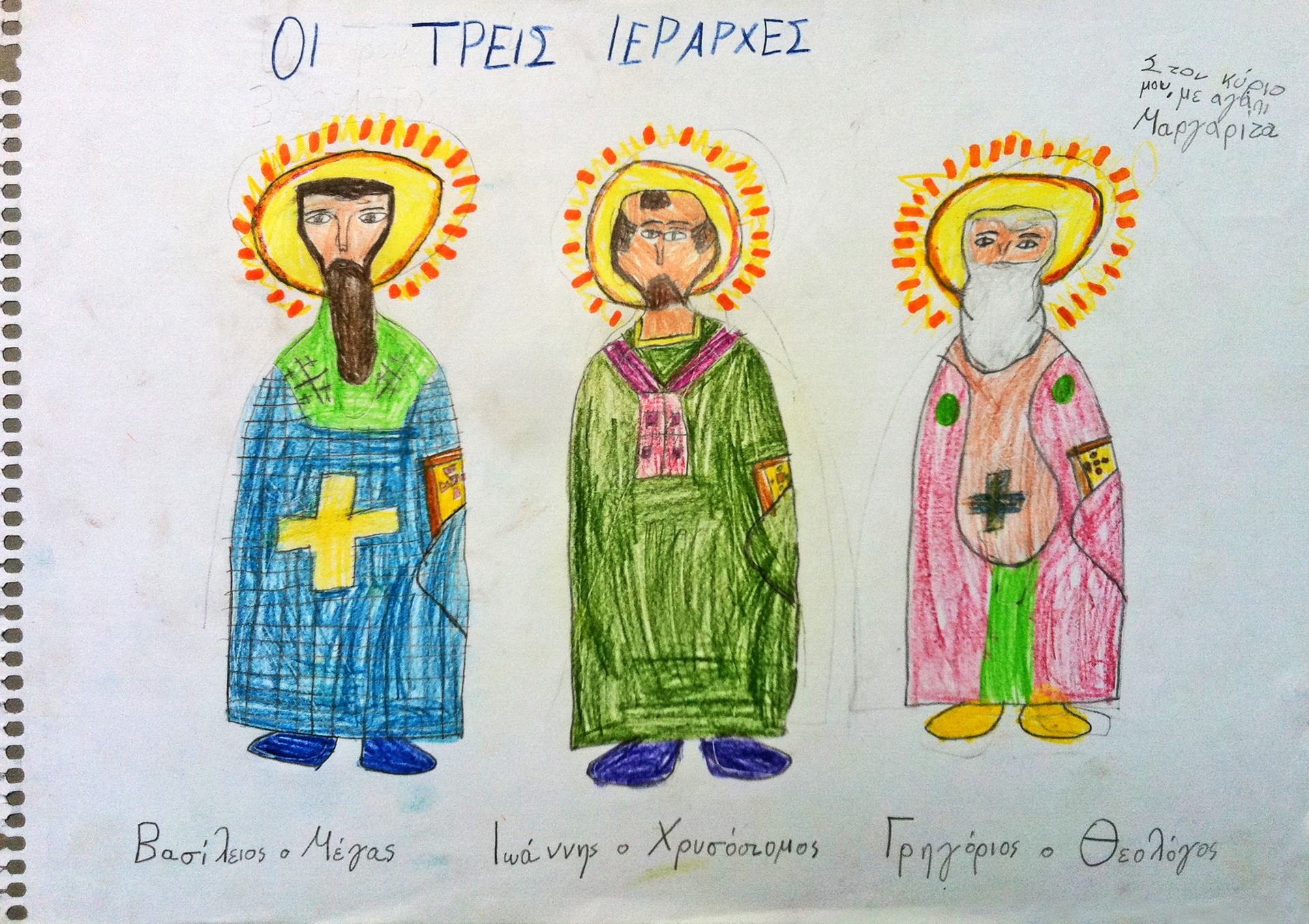 Σχέδιο της οχτάχρονης Μαργαρίτας Καρλοπούλου προς τον δάσκαλό της με αφορμή τη σχολική γιορτή των Τριών Ιεραρχών. Οι συγκεκριμένοι Πατέρες υπήρξαν σπουδαίες περιπτώσεις των Γραμμάτων και της Γλώσσας μας, άλλο αν κατέλήξαν (όπως το σύνολο των θρησκευτικών και εθνικών εορτών) στην Πανήγυρη τους πέριξ του Ναού, (σημαντικότερη εκκλησία των Πετραλώνων και κεντρική αρτηρία τους) να μυρίζει λουκουμάδες ακούγοντας τις γεννήτριες των μικροπωλητών που πουλάν κινέζικα παιχνίδια (συνήθως όπλα) σε πλανόδιους πάγκους. Στο εσωτερικό του Ναού δεν εισήλθα αλλά η τόση πολύ φωταγωγία που κυριαρχεί εκεί μέσα και τα μανιερίστικα τοιχογραφήματα σε συνδυασμό με τα συνήθη κηρύγματα των «λειτουργών», μας αποτρέπει να «απαγκιάσουμε» ψυχικώς, έστω και για λίγο.