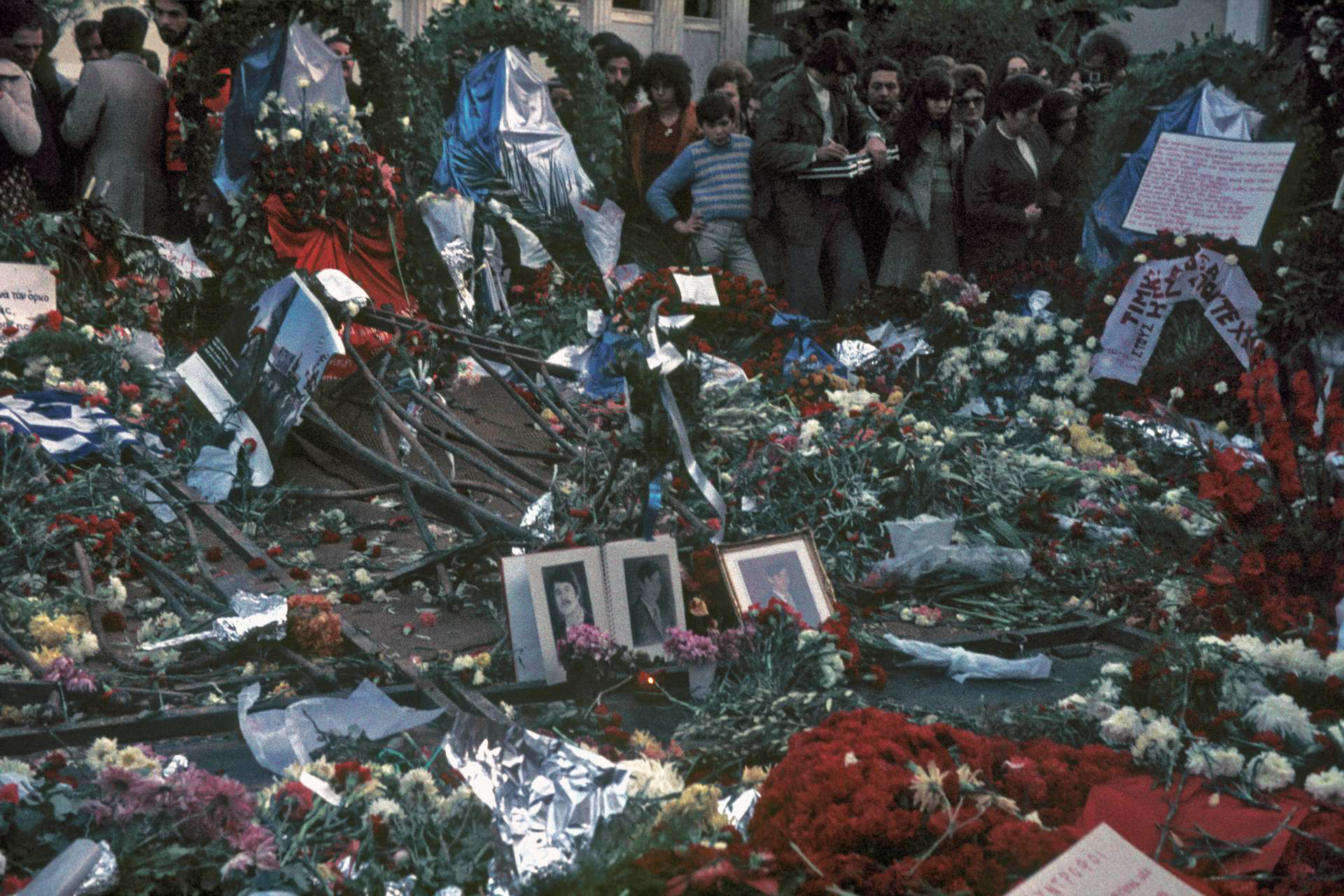 Στη φωτογραφία που μας παραχώρησε ο δημοσιογράφος (πολιτιστικού), Γιάννης Λώλος της εκλιπούσας Αθ. Παπανικολάου (για το αρχείο της Fosphotos), φωτογραφίες τριών από τα θύματα (στη συνέχεια, γεννιέται ένα θέμα και παίρνει διαστάσεις αστικού μύθου: «Οι νεκροί του Πολυτεχνείου») τοποθετήμενα στην είσοδο του Πολυτεχνείου και την στραπατσαρισμένη πόρτα από το τανκ. Είναι Νοέμβριος του ’74, γύρω βλέπουμε λουλούδια, πολλά κόκκινου χρώματος λουλούδια, βλέπουμε στεφάνια με κορδέλες και τον τίτλο αυτού του ποστ, βλέπουμε άντρες με ζιβάγκο και μούσια. Σαράντα χρόνια πέρασαν, ή σαράντα λεπτά;
