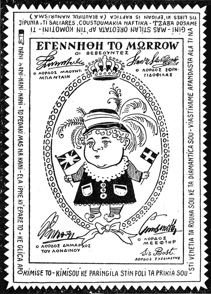*Η γελοιογραφία είναι του Μποστ (περίπου 1960), μια από τις πρώτες χρήσεις των greeklish με το λεξιπλαστικό ύφος του γελοιογράφου πολύ πριν τα greeklish.