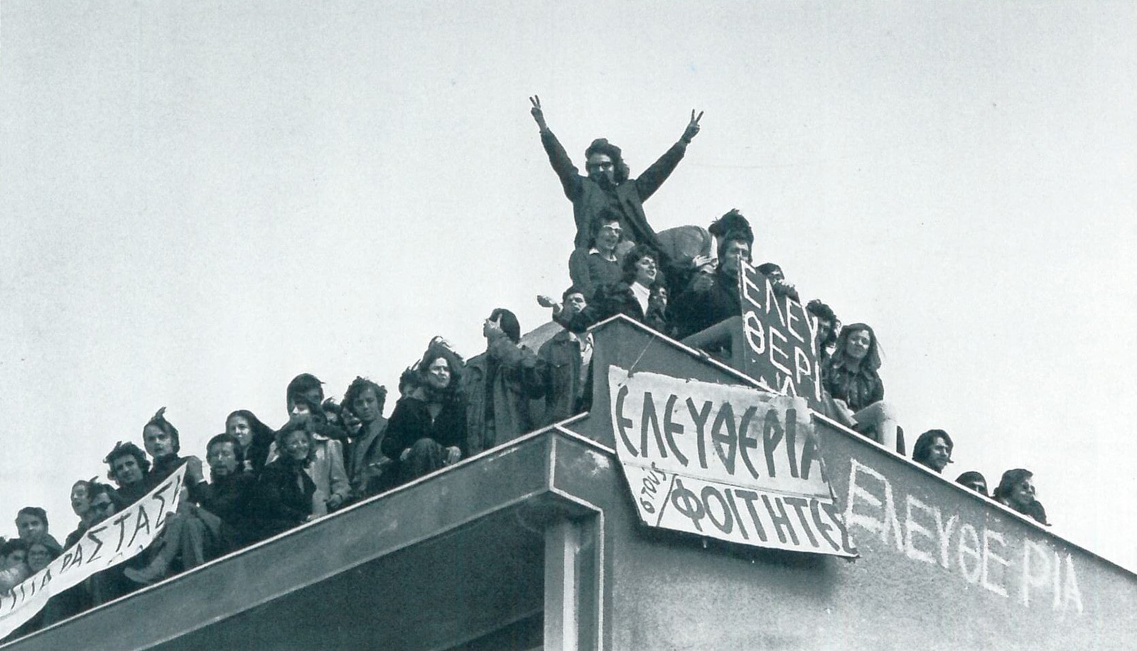 Φοιτητές στην ταράτσα της Νομικής κατά τη διάρκεια της κατάληψης της Σχολής, 21 Φεβρουαρίου 1973 (Αρχείο Αρ. Σαρρηκώστα)