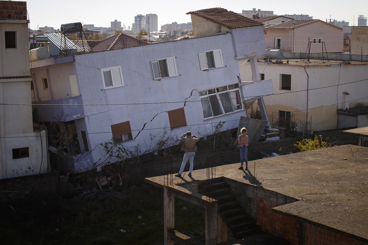 epaselect epa08028844 Locals look at a destroyed house after an earthquake hit Durres, Albania, 27 November 2019. Albania was hit by a 6.4 magnitude earthquake on 26 November leaving until now over 30 people dead and 200 injured. EPA/VALDRIN XHEMAJ
