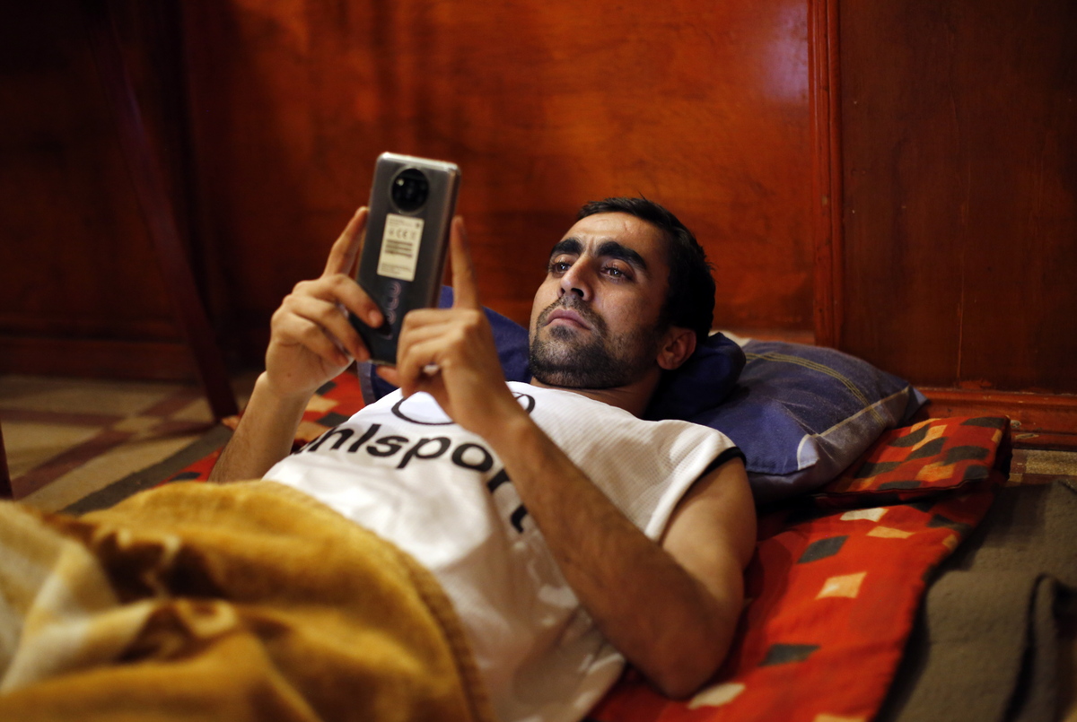epa09515319 Afghan refugee Farid Alizadeh checks his phone as he prepares to go to bed at the cafe where works in Tehran, Iran, 29 September 2021 (issued 09 October 2021). Twenty-three-year-old Farid is an Afghan refugee who arrived in Iran in 2019, seeking a better life as socio-economic difficulties, conflict and instability kept rising back home. He was hoping to raise enough money to marry his girlfriend to finally move in together but since the takeover of Afghanistan by the Taliban in August 2021, he said he has not heard from her anymore and does not know where she is after she left like many Afghans in the panic and rush. Every day at the cafe where he works and also sleeps, he checks his phone for hypothetical news of his girlfriend and keeps hoping to have news. According to the latest figures by the Iranian Government in October 2020, and which are being updated, some 780,000 Afghans live in Iran as refugees. EPA/ABEDIN TAHERKENAREH