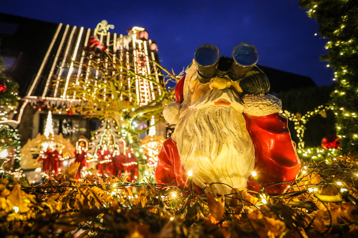 Κάθε χρόνο, τα βράδια μέχρι και την παραμονή της Πρωτοχρονιάς, στο σπίτι και στον κήπο της οικογένειας Μπόρχαρτ ανάβουν περίπου 60.000 λάμπες. Έτσι και φέτος, μια φιγούρα του Άγιου Βασίλη με κιάλια μπροστά από το φωτισμένο χριστουγεννιάτικο σπίτι στην περιοχή του Delmenhorst, βόρεια Γερμανία, 29 Νοεμβρίου 2020. EPA / FOCKE STRANGMANN