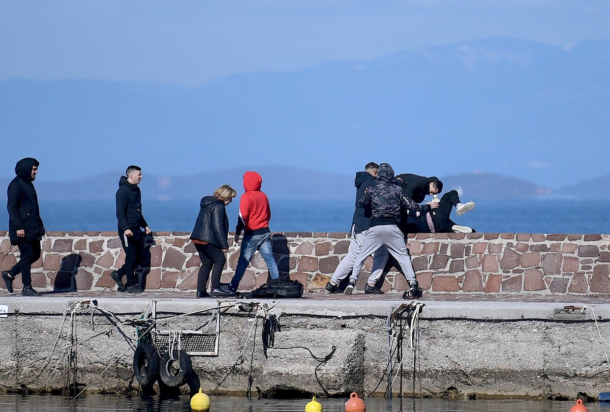 Άτομα τα οποία νωρίτερα είχαν παρεμποδίσει πρόσφυγες και μετανάστες να αποβιβαστούν στην Θέρμη της Μυτιλήνης επιτίθενται σε ξένους δημοσιογράφους και φωτορεπόρτερ καθώς και σε μέλη ΜΚΟ , Κυριακή 1 Μαρτίου (φωτ. ΑΠΕ).