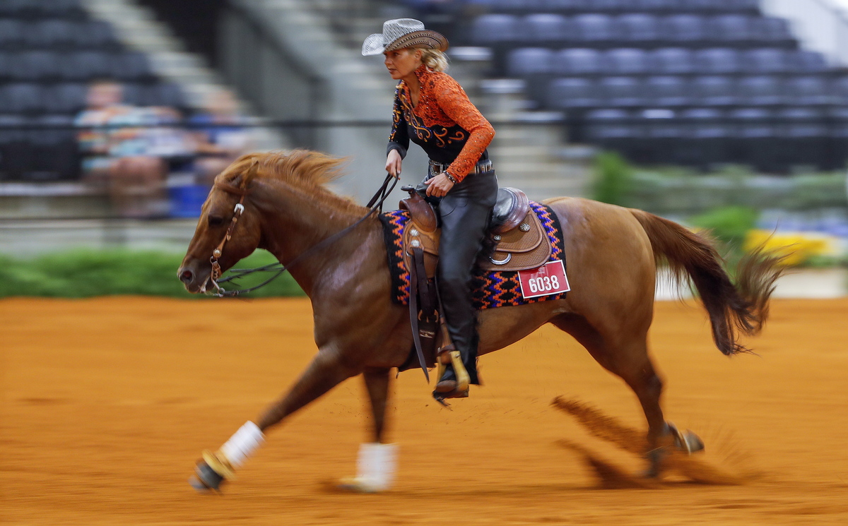 epa07016267 Lia Freriks of the Netherlands rides Ready for Revolution during the Reining competition at the FEI World Equestrian Games 2018 at the Tryon International Equestrian Center in Mill Spring, North Carolina, USA, 12 September 2018. The World Equestrian Games continue through 23 September 2018. EPA/ERIK S. LESSER
