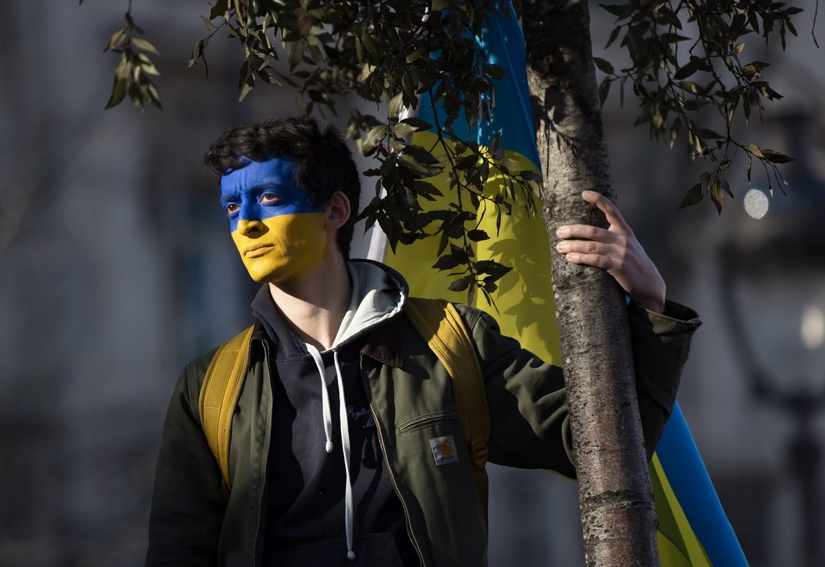 Διαδηλωτής έχει βαμένο το πρόσωπο του με τα χρώματα της σημαίας της Ουκρανίας. Παρίσι, Γαλλία, 27 Φεβρουαρίου 2022. EPA/IAN LANGSDON