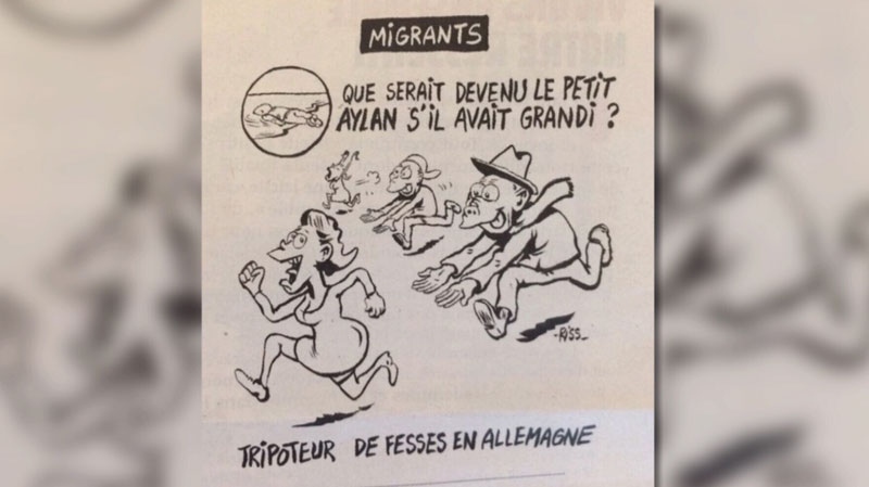 Η δεύτερη και πιο πρόσφατη ήταν την περασμένη Τετάρτη 13 Ιανουαρίου με σκίτσο που παρουσιάζει τον Αϊλάν, τον τρίχρονο πρόσφυγα που βρέθηκε νεκρός στις ακτές της Αλικαρνασσού, ως ενήλικο να βρίσκεται ανάμεσα στους πρόσφυγες που κατηγορήθηκαν για την σεξουαλική παρενόχληση Γερμανίδων την παραμονή της πρωτοχρονιάς στην Κολωνία. «Τι θα γινόταν ο μικρός Αϊλάν αν είχε μεγαλώσει;» αναρωτιέται ο σκιτσογράφος και εικονογραφεί τα πρόσωπα των προσφύγων που κυνηγούν τα θύματα σεξουαλικής παρενόχλησης με μορφή μαϊμούς, ενώ η λεζάντα απαντά «θωπευτής οπισθίων στη Γερμανία». Φυσικά, σκοπός του ήταν άλλωστε, το σκίτσο προκάλεσε και πυροδότησε μεγάλη συζήτηση κι αντιπαράθεση στα μέσα κοινωνικής δικτύωσης. Όπως πάντα συμβαίνει εκεί, όχι ακριβώς με τους καλύτερους όρους δημόσιου διαλόγου. Και για άλλη μια φορά με τη σάτιρα στο επίκεντρο. Έχει τελικά όρια; Ποια είναι αυτά; Είμαστε ακόμα Charlie;