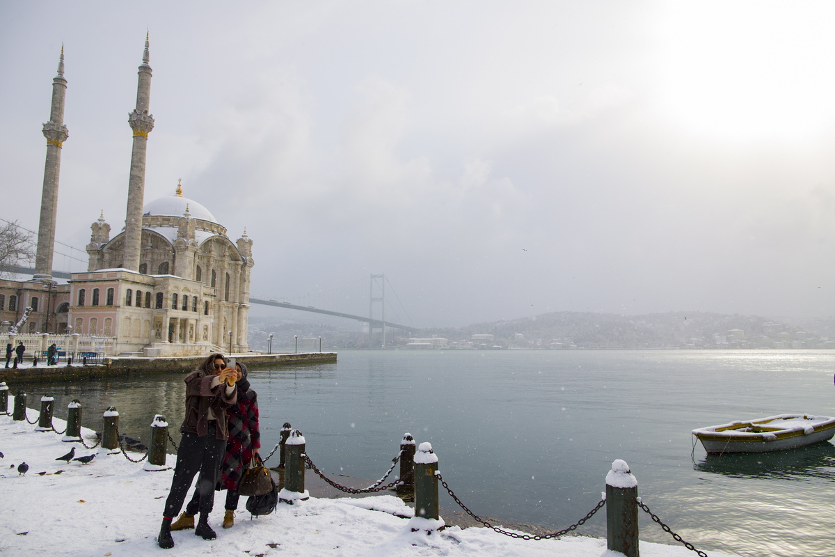epa08945651 People take pictures ın front of Ortakoy Mosque near Bosphorus in a snowy day in Istanbul, Turkey, 18 January 2021. EPA/TOLGA BOZOGLU