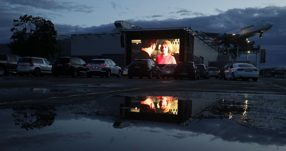 epa08394375 Cars are seen at the drive-in movie theater at technical museum in Speyer, Germany, 30 April 2020. Countries and companies around the world are taking increased measures to stem the widespread of the SARS-CoV-2 coronavirus which causes the Covid-19 disease. EPA/RONALD WITTEK